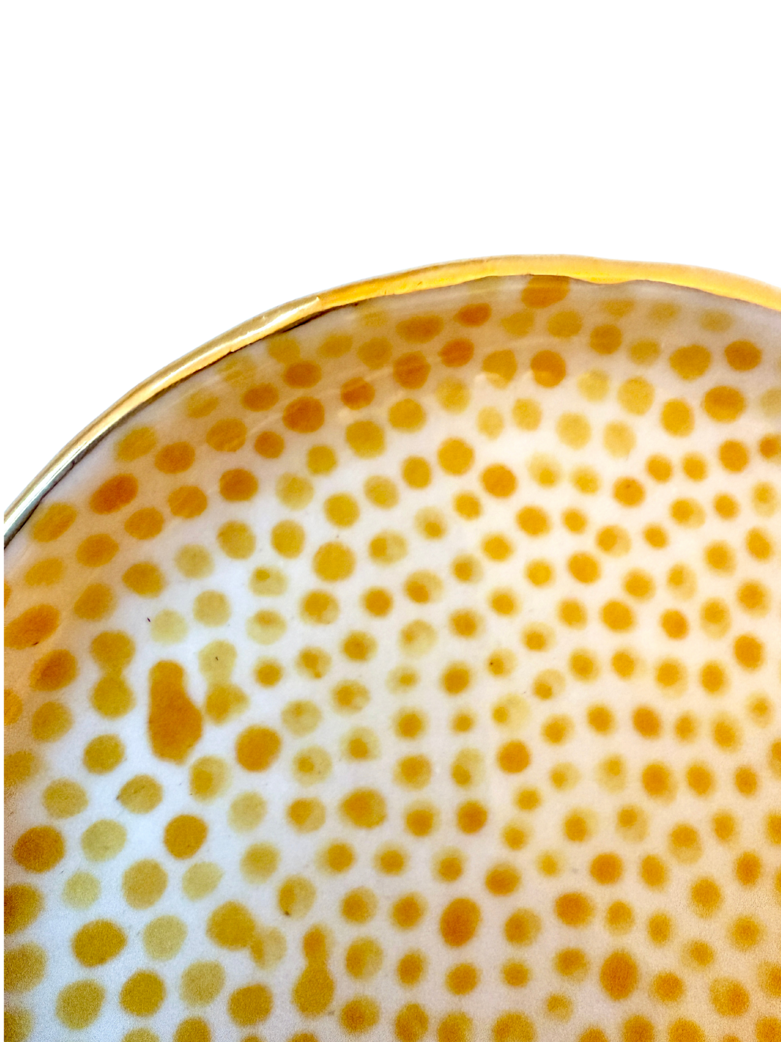 A warm blend of craftsmanship and color, this porcelain trinket plate features a soft amber dotted pattern with a hand-painted gold rim. Its organic form and glossy finish make it perfect for holding jewelry, coins, or keepsakes while adding a subtle glow to any surface.
