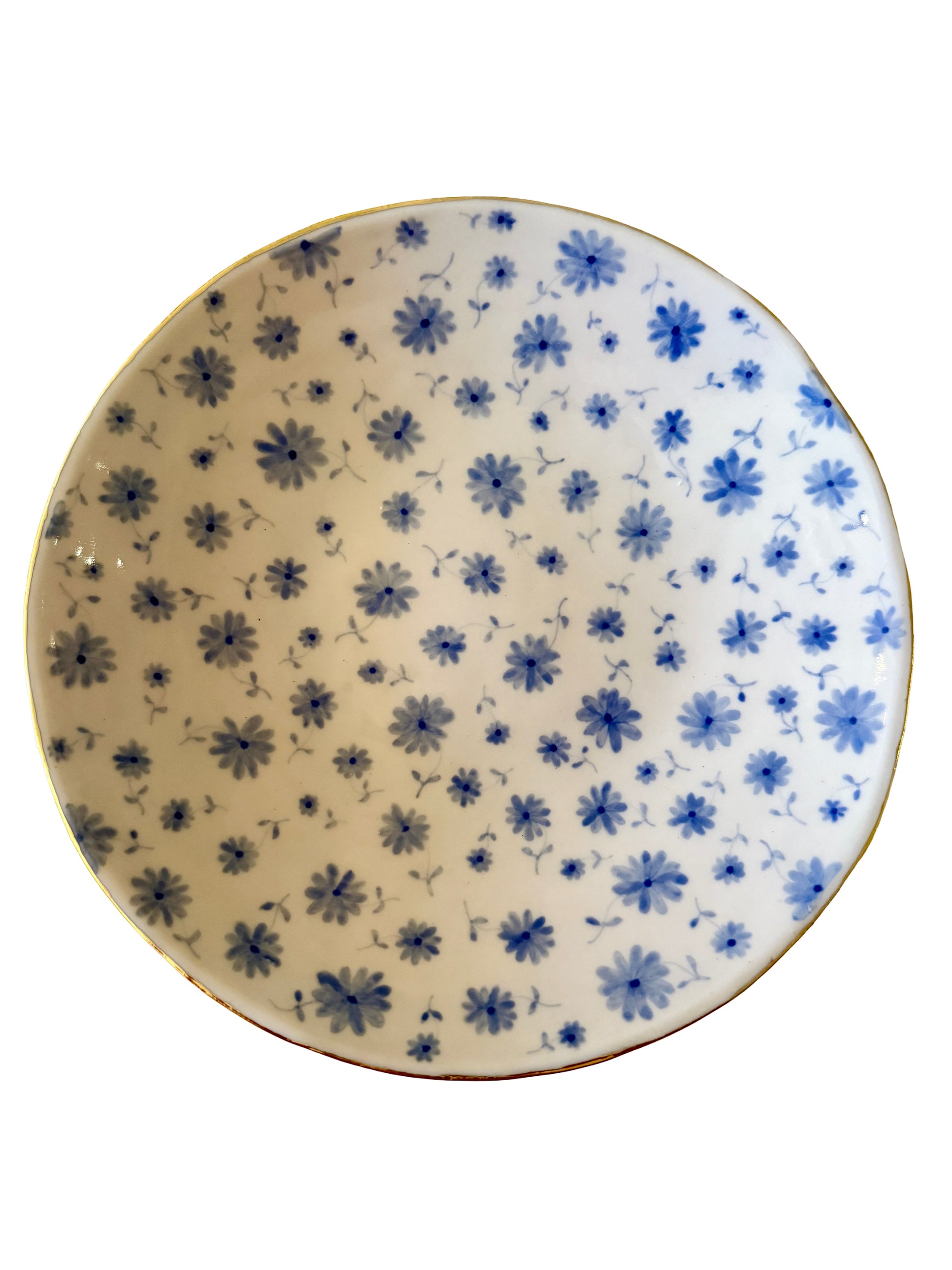 This handcrafted large flat porcelain bowl features a soft blue floral pattern with a hand-painted gold rim and a flared edge. Designed for both everyday use and display, it’s perfect for serving salads, fruits, or as a decorative centerpiece. The elegant glaze and subtle detailing make it a beautiful addition to modern tableware and home decor.