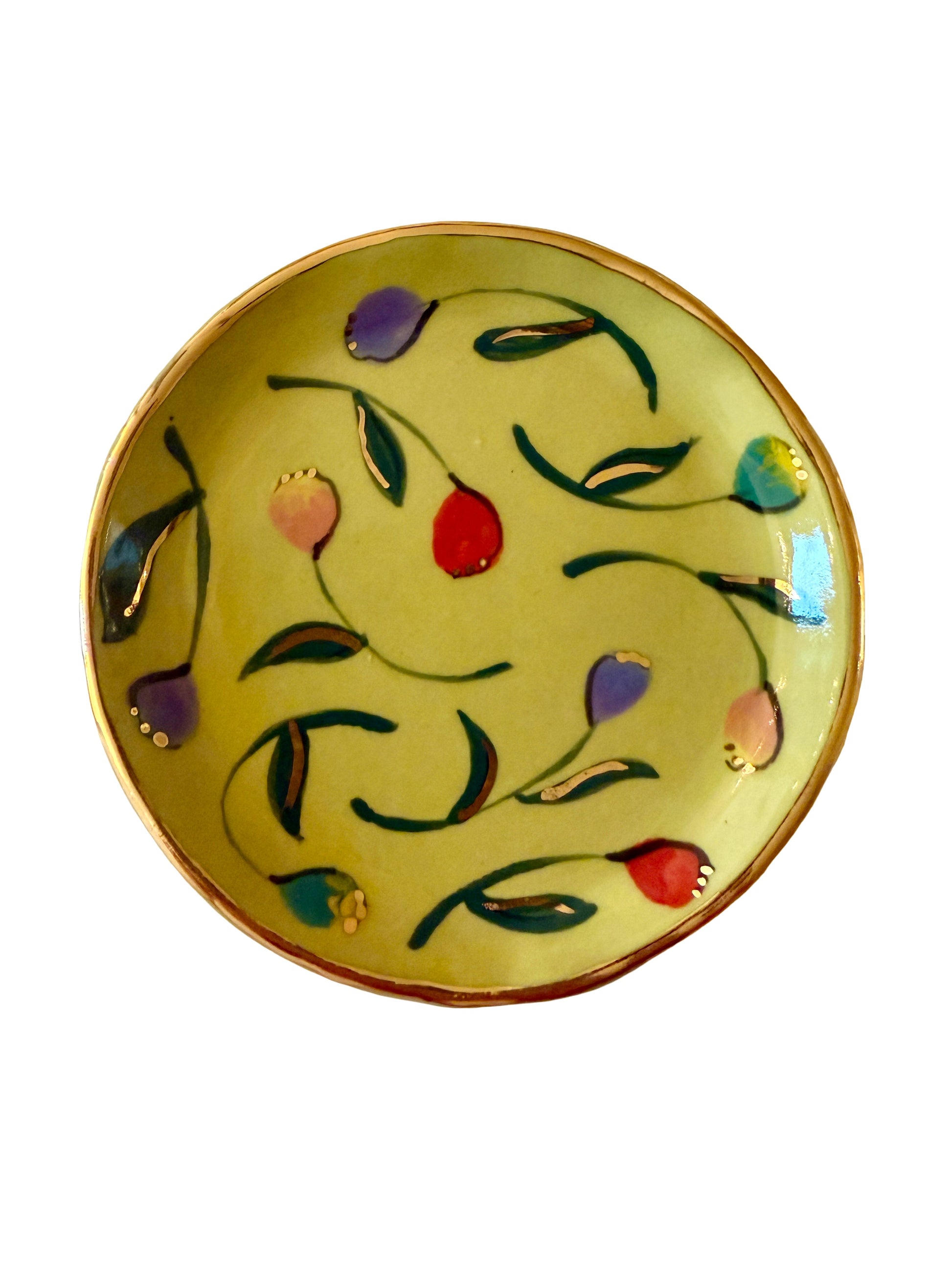 A charming chartreuse porcelain trinket plate featuring delicate and colorful tulips and a hand-painted gold rim. Each piece is handcrafted with fine detailing, creating a warm and timeless accent for your vanity, dresser, or coffee table. Perfect for holding jewelry, keys, or small treasures.
