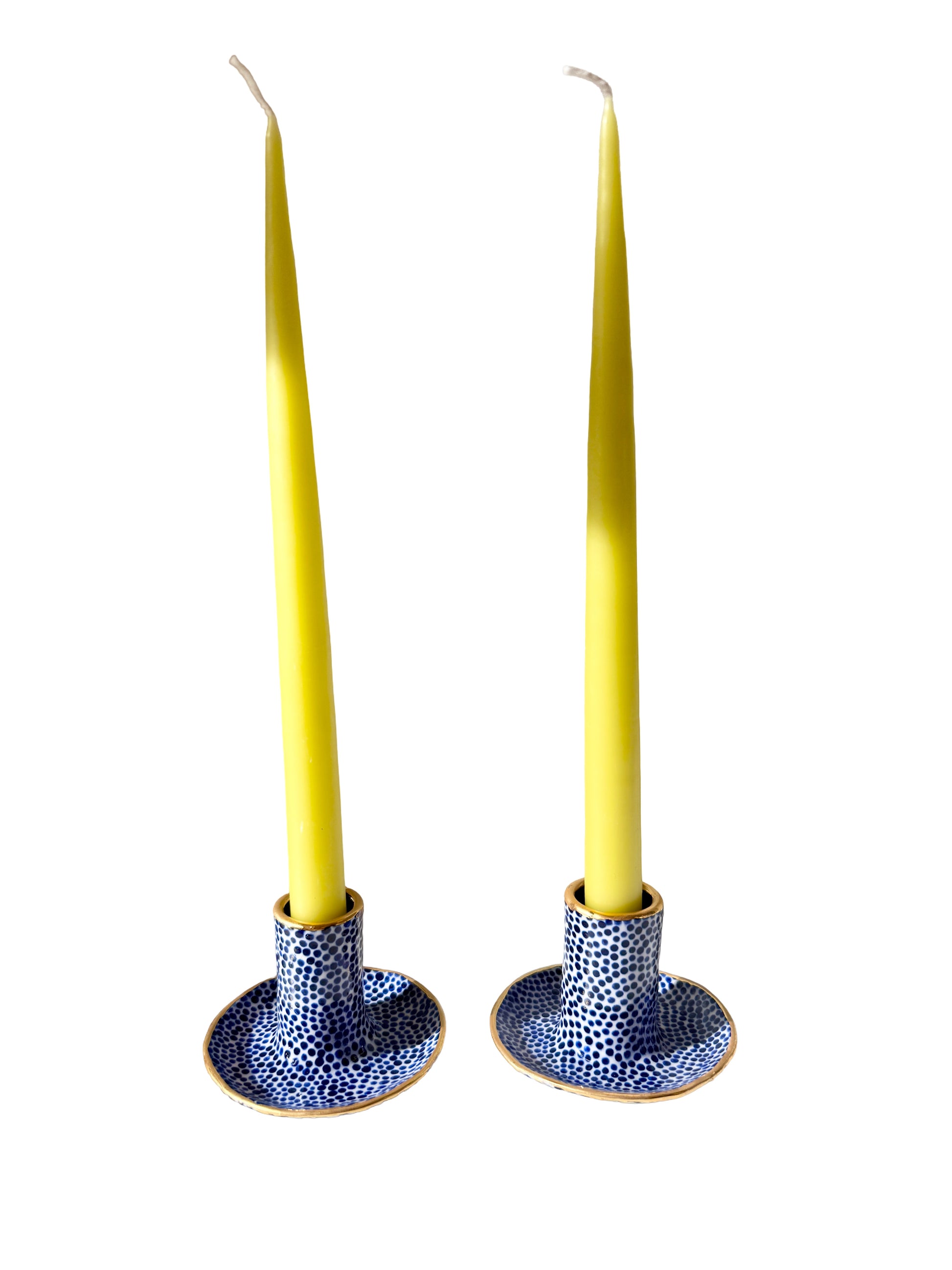 Elevate your table or mantel with these handcrafted porcelain candle holders adorned with a dark blue dot pattern and gold-rimmed edges. Their sophisticated pattern and glossy finish add warmth and sophistication to any setting. Perfect for taper candles, dinner tables, or thoughtful gifting.