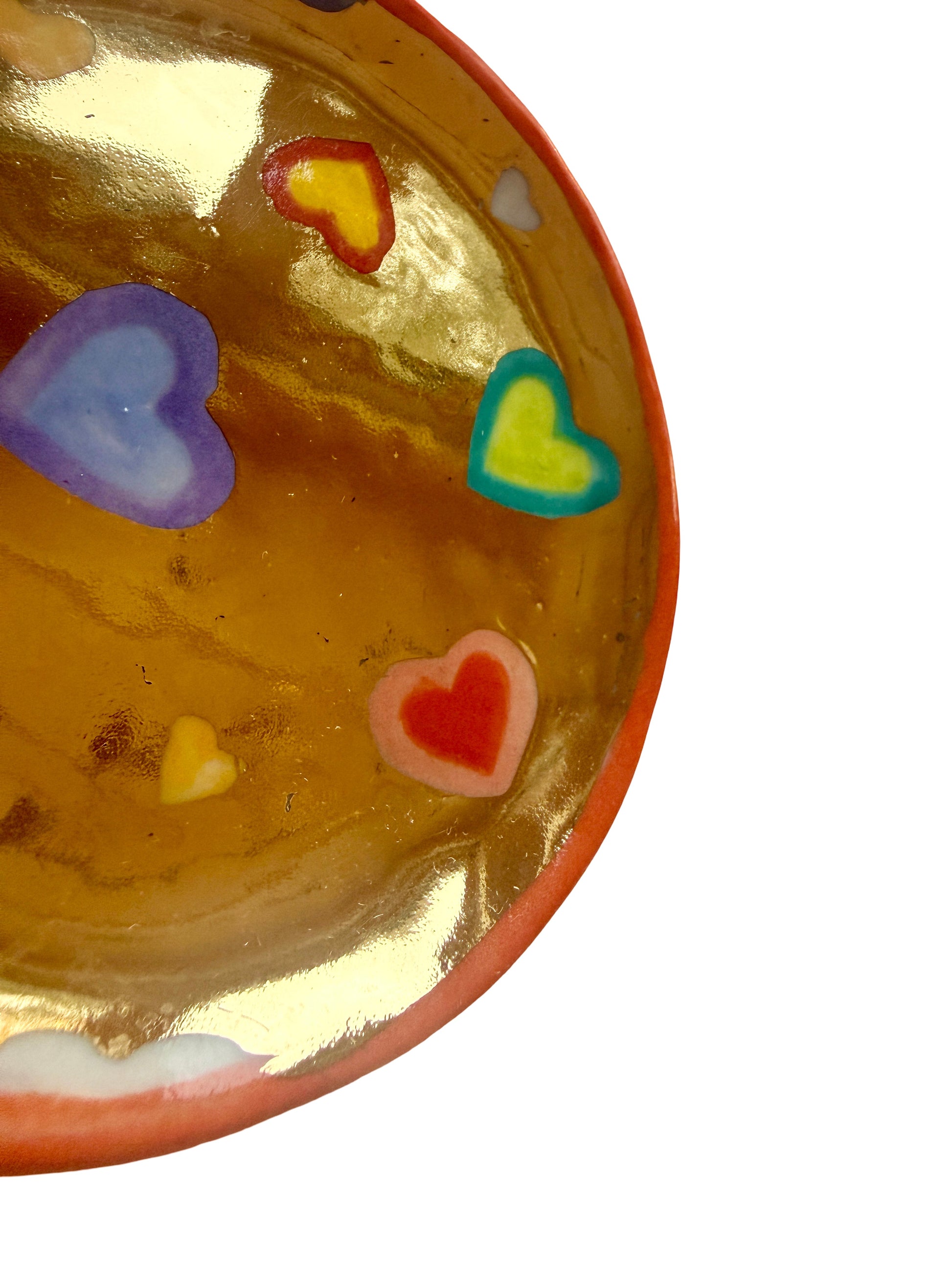 This limited edition 2026 Valentine trinket plate showcases a warm blend of craftsmanship, color, and sparkle. The porcelain trinket plate features brightly colored hearts floating on a gold background. Its organic form and glossy finish make it perfect for holding jewelry, coins, or keepsakes while adding a subtle glow to any surface. Please note that the gold background is a glaze and is not completely uniform in color and texture.