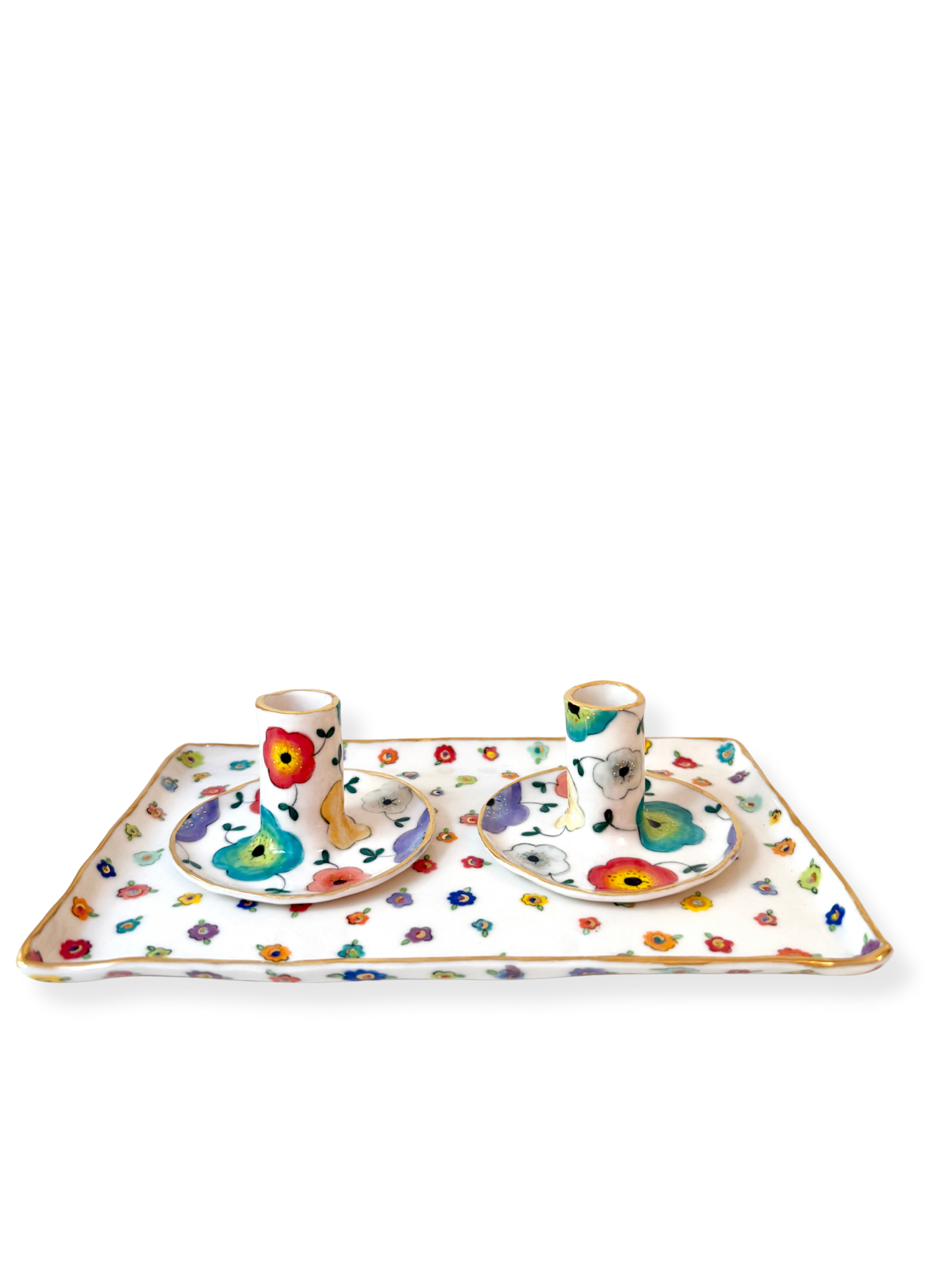 Bring color and charm to your space with these handcrafted porcelain large candle holders adorned with bold floral designs and a hand-painted gold rim. Each piece is detailed with bright flower patterns that catch the light beautifully. Perfect for taper candles, table settings, or as decorative accents that add warmth and character.