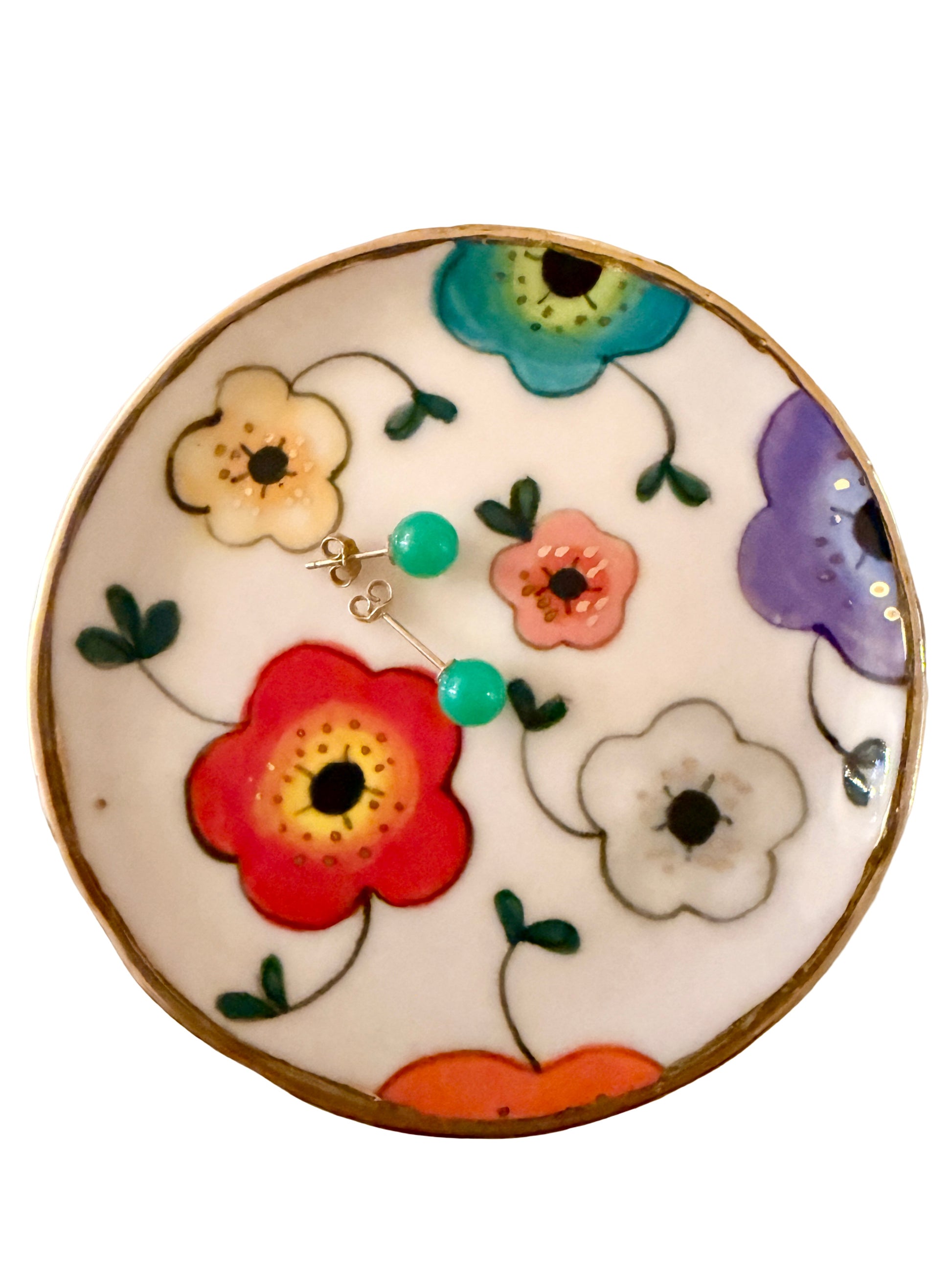 A charming porcelain trinket plate featuring a large floral motif and a hand-painted gold rim. Each piece is handcrafted with fine detailing, creating a warm and timeless accent for your vanity, dresser, or coffee table. Perfect for holding jewelry, keys, or small treasures.