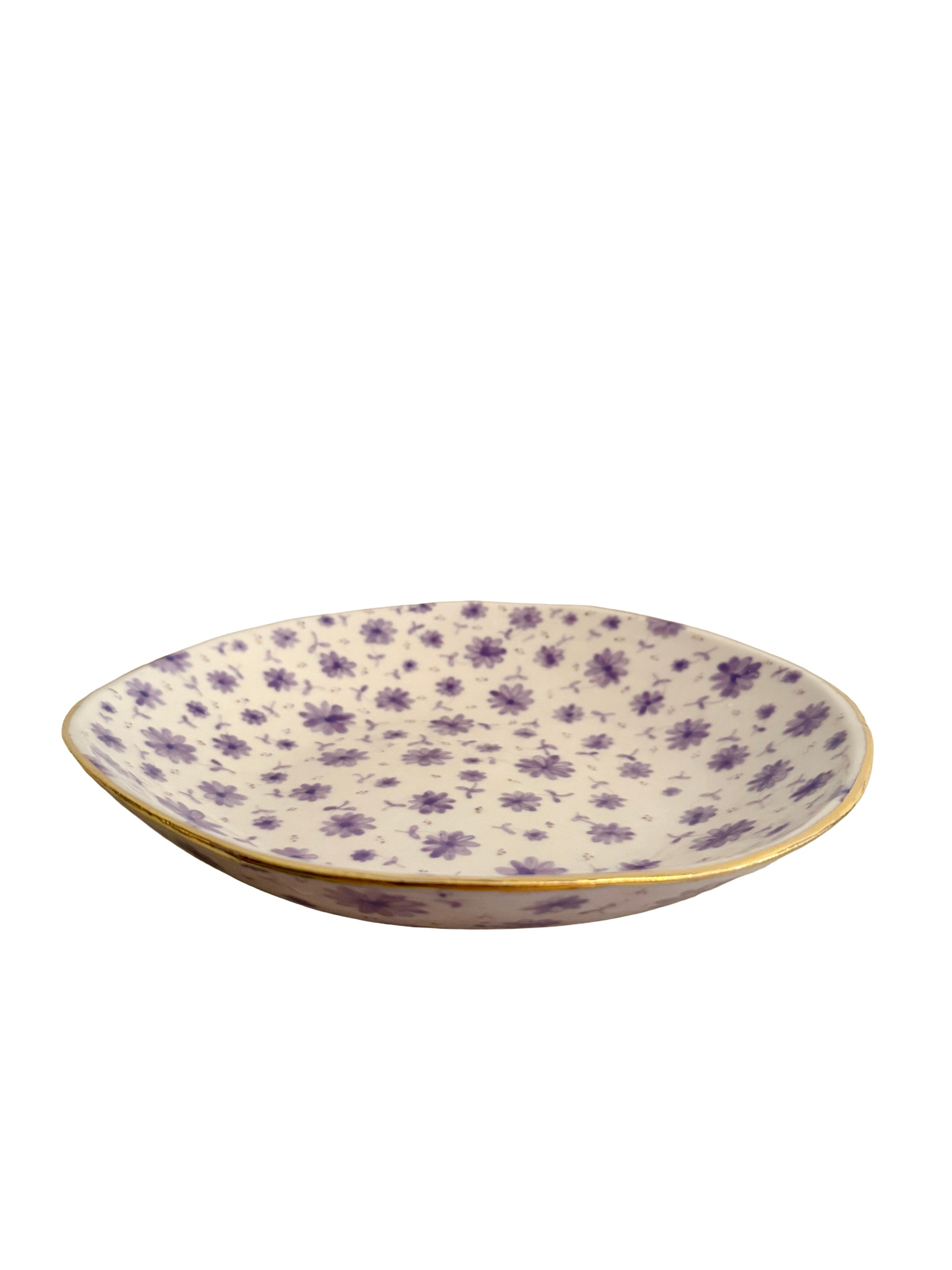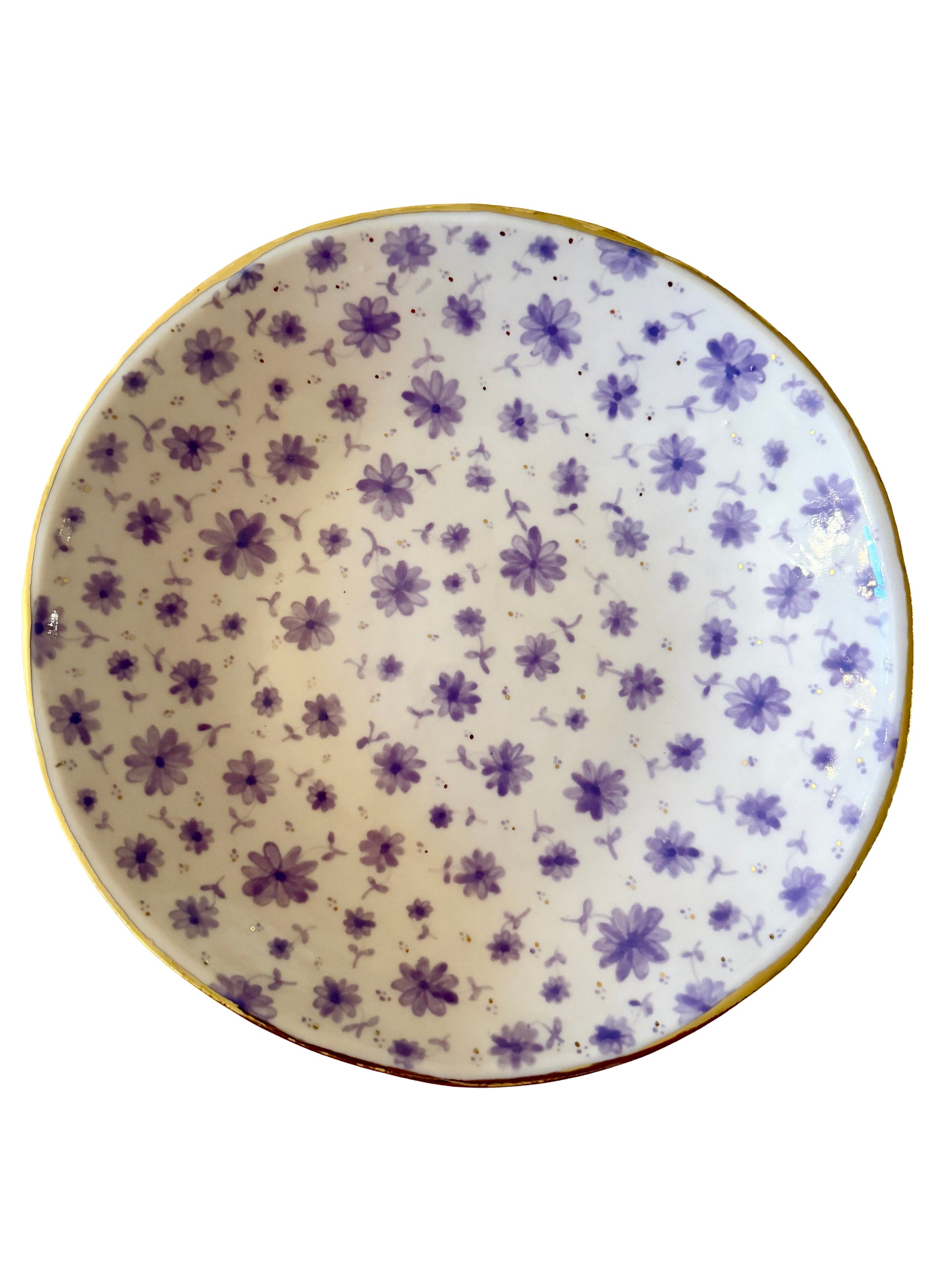 This handcrafted large flat porcelain bowl features a soft lavender floral pattern with a hand-painted gold rim and a flared edge. Designed for both everyday use and display, it’s perfect for serving salads, fruits, or as a decorative centerpiece. The elegant glaze and subtle detailing make it a beautiful addition to modern tableware and home decor.