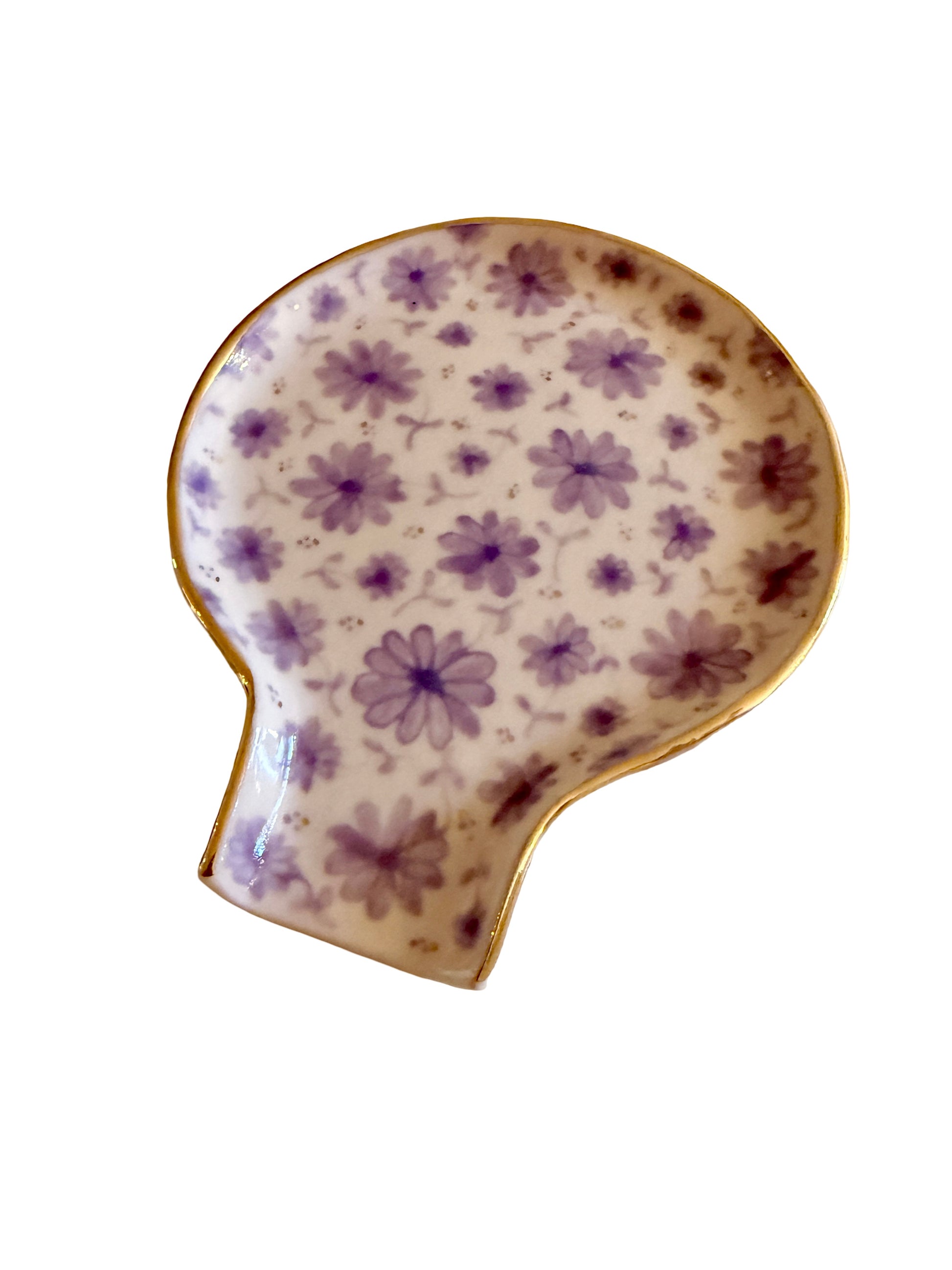 Brighten your kitchen with this handcrafted porcelain spoon rest featuring a soft lavender floral pattern and a hand-painted gold rim. Designed to keep counters clean in style, it combines practicality with artisan beauty. Perfect for everyday cooking or as a charming decorative accent.