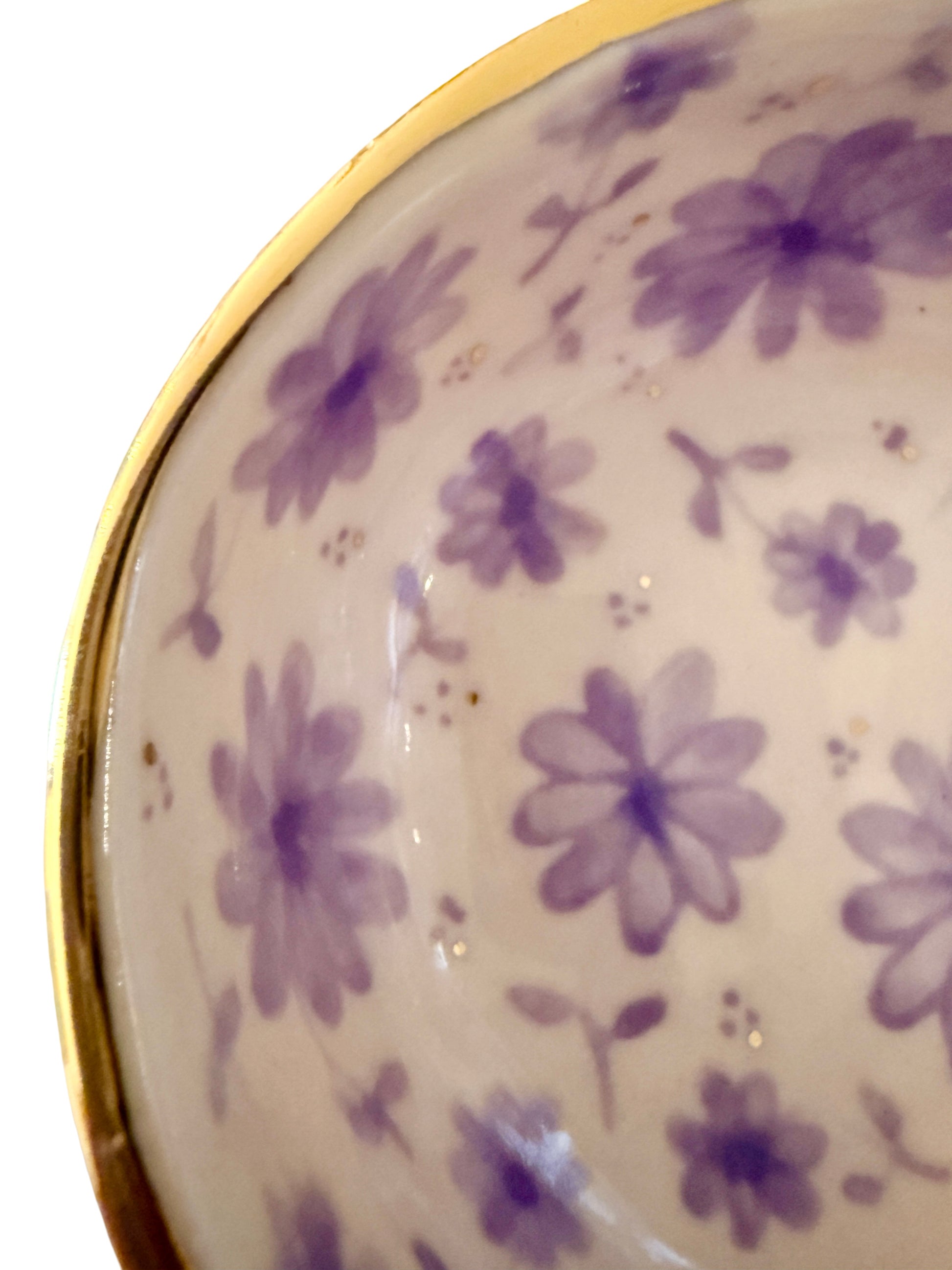 Designed to stand out quietly, the Lavender Toile Trinket Bowl pairs soft lavender tones with a hand-painted gold rim. Each porcelain piece is handcrafted, featuring a floral pattern that feels modern yet timeless. Perfect for storing jewelry, loose change, or simply adding an elegant touch to your space.