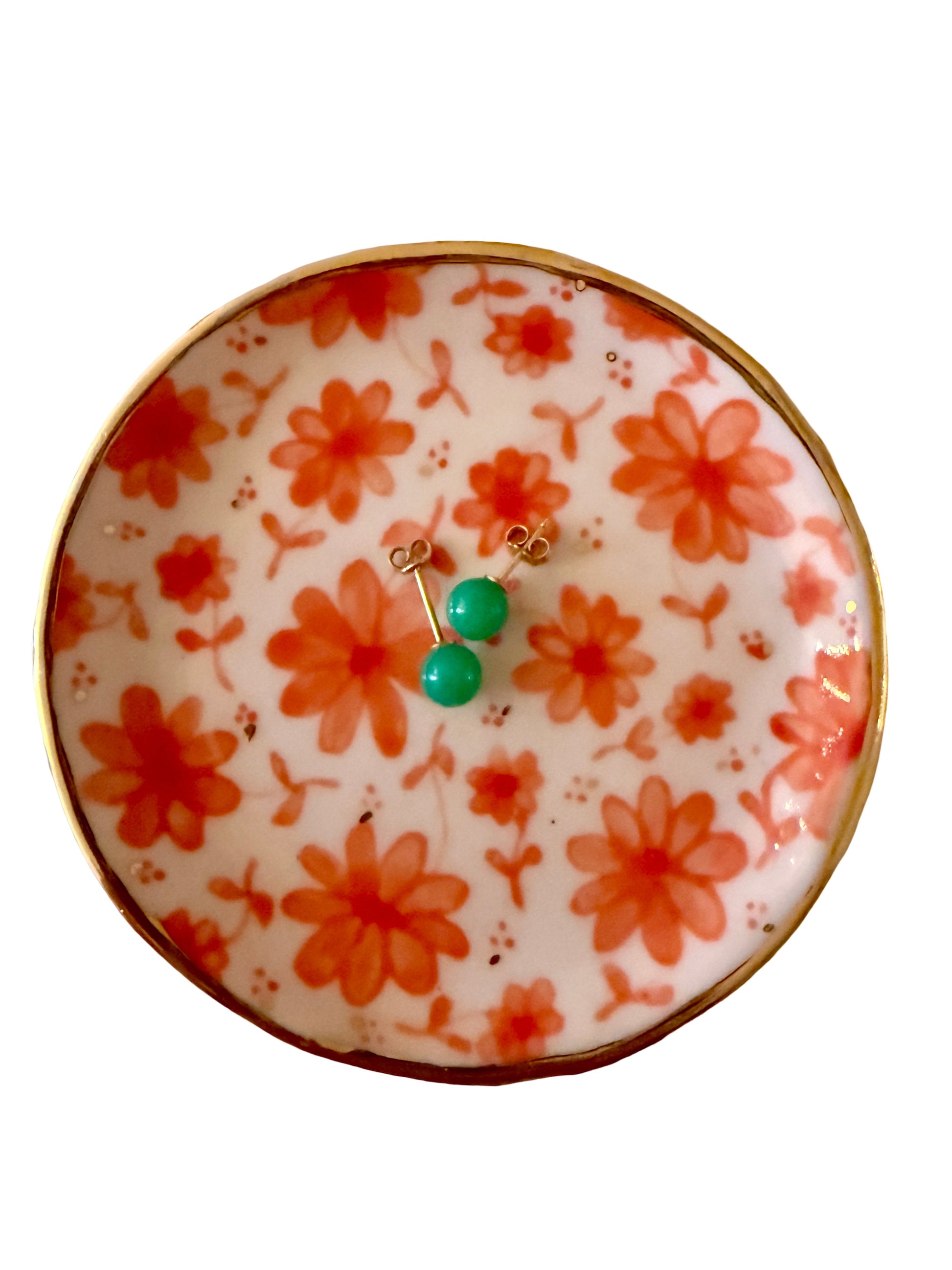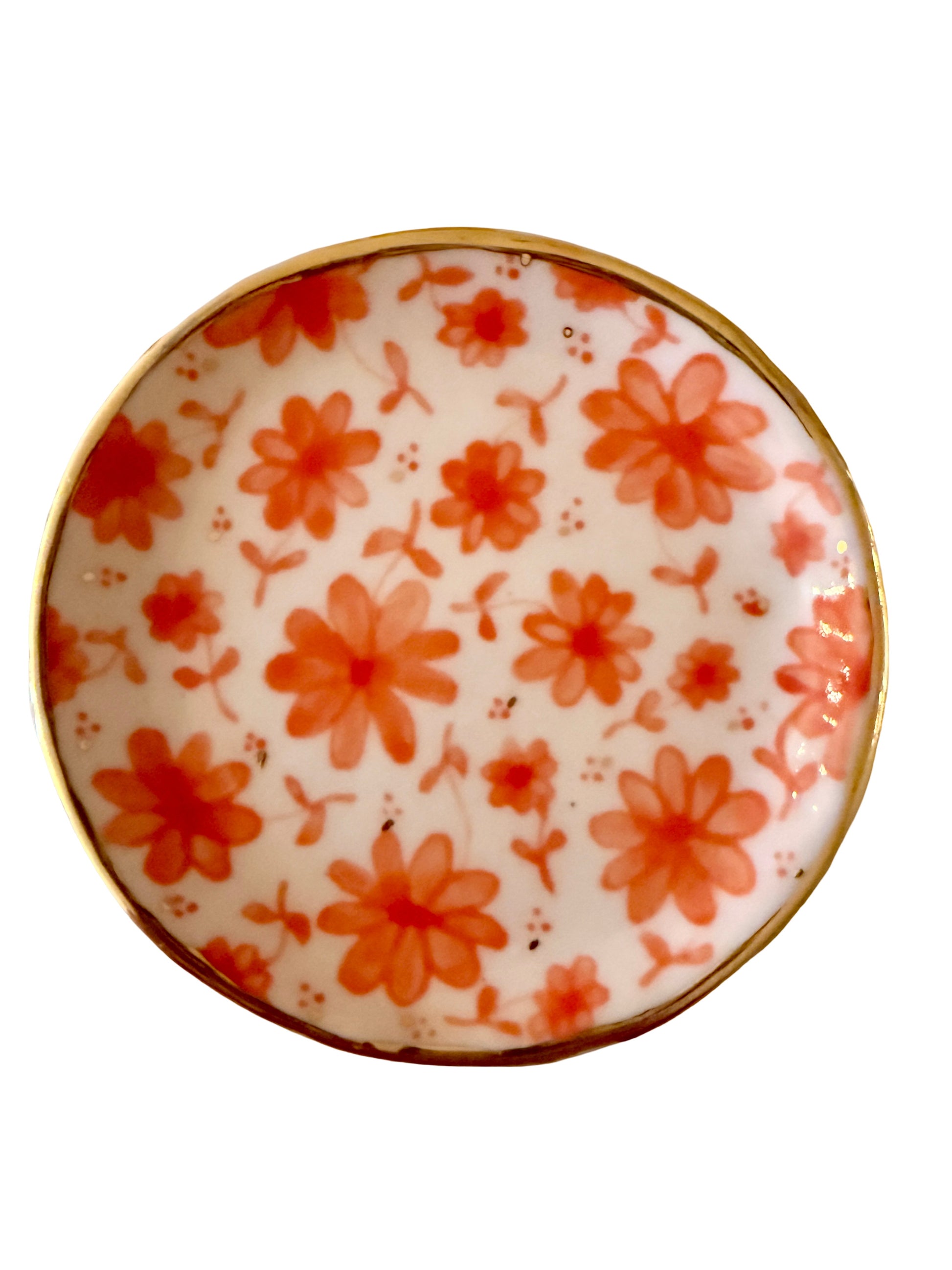 A warm blend of craftsmanship and color, this porcelain trinket plate features a soft red toile pattern with a hand-painted gold rim. Its organic form and glossy finish make it perfect for holding jewelry, coins, or keepsakes while adding a subtle glow to any surface.
