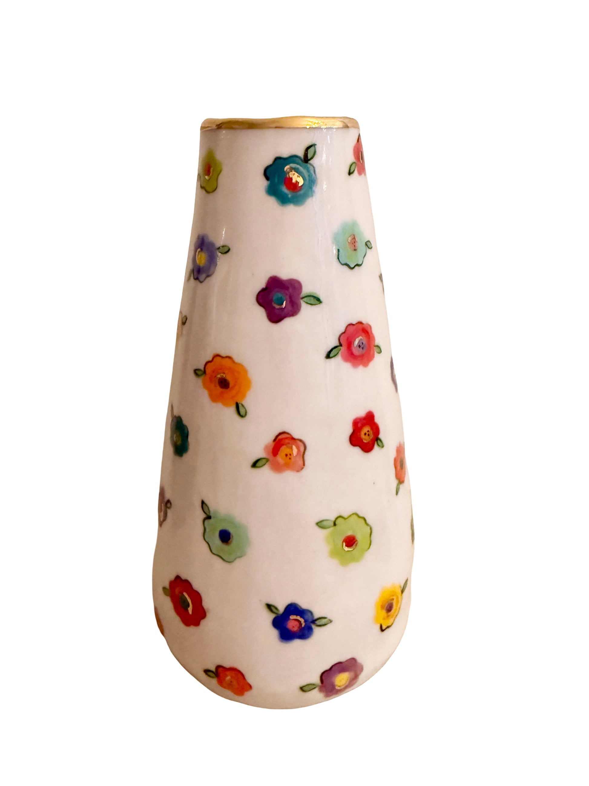Delicate porcelain bud vase featuring a hand-painted small flower pattern, gold rim detail, and dark blue interior. Ideal for showing off one or two spectacular blooms on a dining table or shelf. A handcrafted ceramic vase that adds a pop of color and charm to any setting.