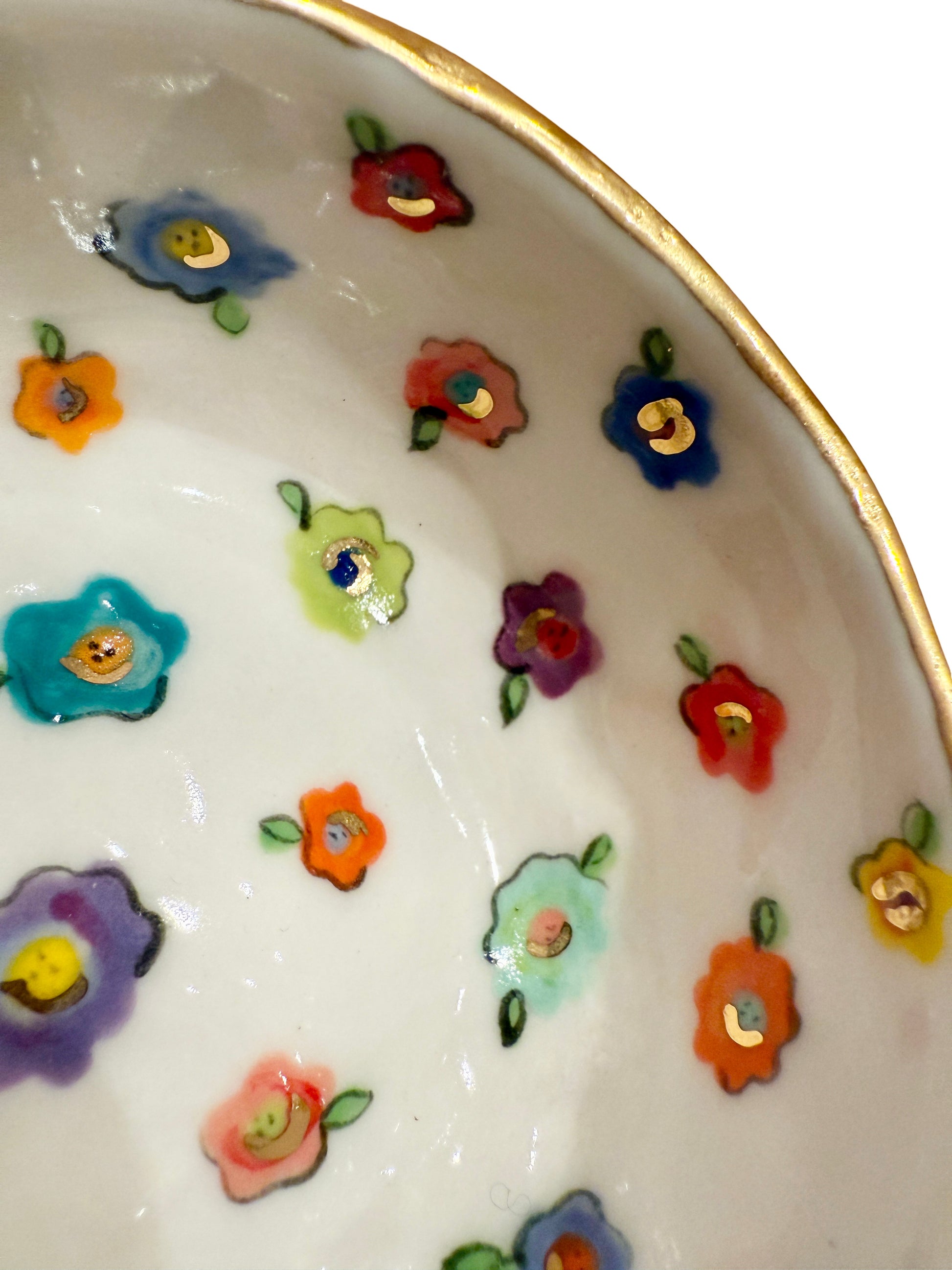 Elegant white porcelain trinket dish featuring hand-painted small flowers in vibrant colors with a gold-trimmed edge. Its floral pattern and soft curves make it a stylish jewelry or ring holder for any vanity or tabletop. Perfect as an artisan gift or home decor accent.