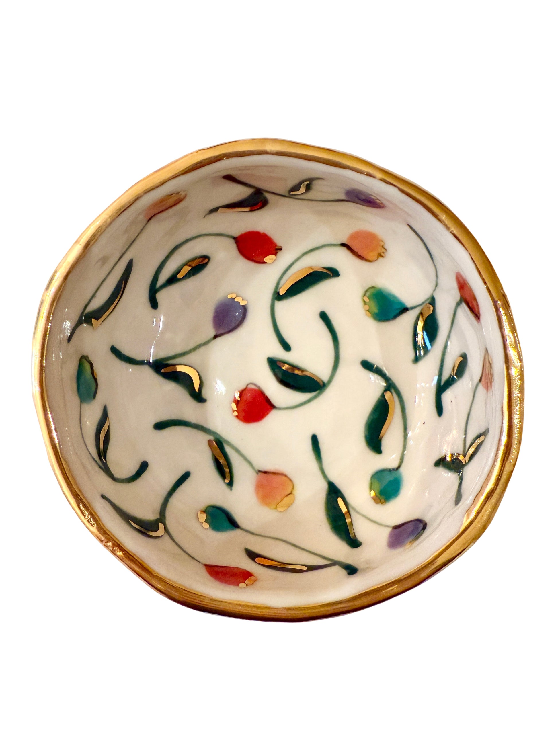 Elegant white porcelain trinket dish featuring hand-painted tulip blooms in vibrant colors with a gold-trimmed edge. Its floral pattern and soft curves make it a stylish jewelry or ring holder for any vanity or tabletop. Perfect as an artisan gift or home decor accent.