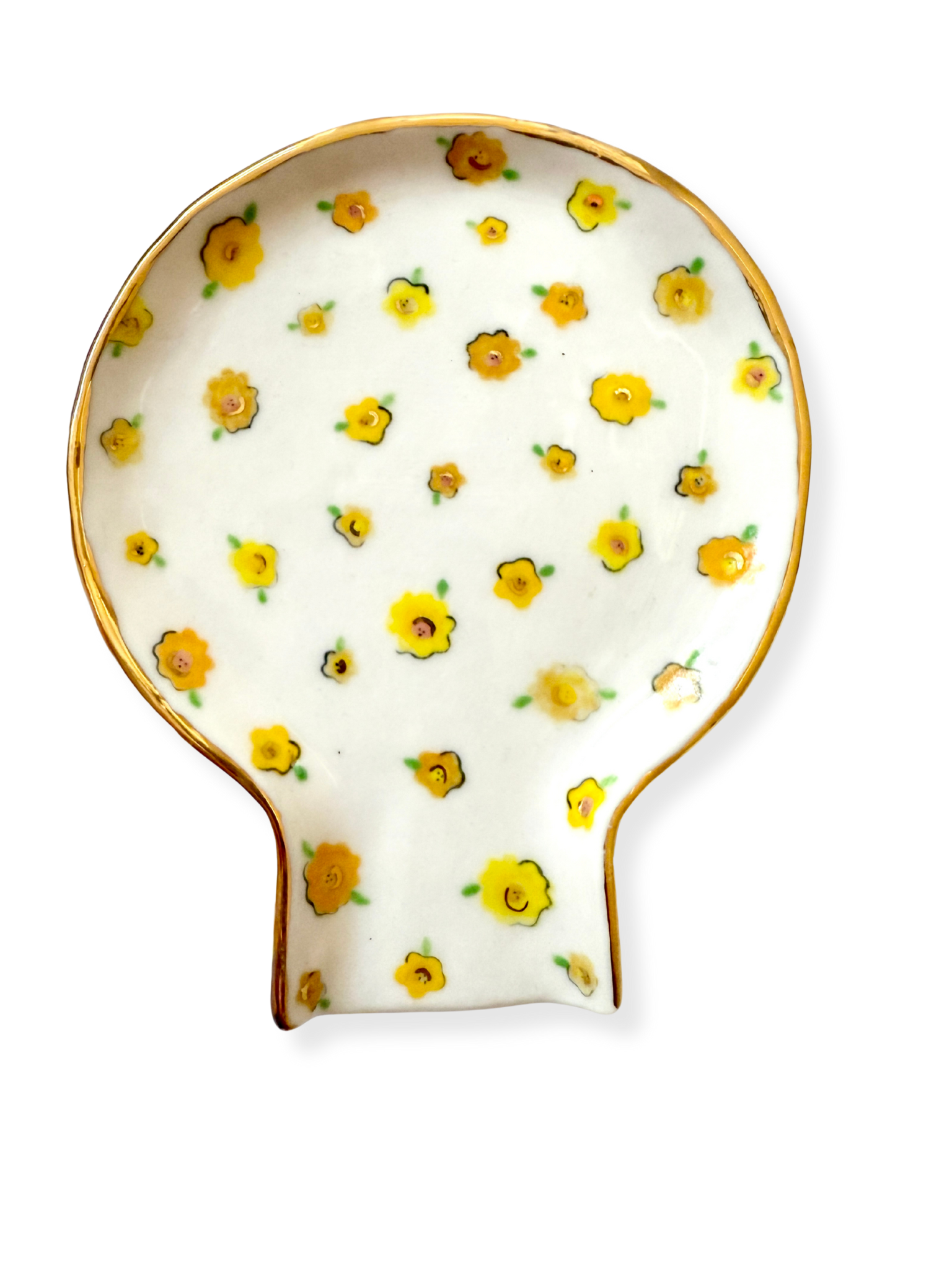 Brighten your kitchen with this handcrafted porcelain spoon rest featuring cheerful yellow floral patterns and a hand-painted gold rim. Designed to keep counters clean in style, it combines practicality with artisan beauty. Perfect for everyday cooking or as a charming decorative accent.
